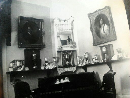 A szalonban volt - főleg fali polcokon - Apukám sok, tenyészállatvásáron elnyert díja. A régi íróasztalon fehér csipketerítőn Jézus szíve szobor, két fehér védőhuzatos piros plüss garnitúra és Keresztmamám teljes alakú festménye előtt, magas kis asztalon egy szép üvegvázában, nyáron mindig friss, nagy csokor virág, és Nagyanyuka hintaszéke.