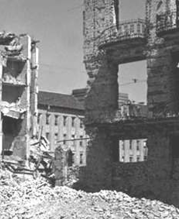 Május 9-én reggel megindultunk gyalog Miklósék Mészáros utcai lakása felé. Alig van ép ház, a fák is ágak nélkül merednek az égnek. Felbukkan a vár, - de csak a várhegy s rajta egy hatalmas kőhalom. Végre meglátjuk a házat. Áll! Az ablakok bedeszkázva, de laknak benne. Felejthetetlen öröm volt újra megölelni egymást. Mária boldogan mesélte érkezését, miként bízta a gyerekeket a barátainkra és rohant szüleit Horányszky utcai lakásához. Az óvóhelyen megbújókról, hosszú zörgetés után kiderült, hogy élnek és Feri, Mária édesapja rögtön jött is segíteni hazahozni a gyerekeket és a csomagokat. Mária cipelte Emilkét, míg Miklóska és Ferike két oldalt kapaszkodott belé míg Farkas Feri meg egy kis kézikocsival húzta a csomagokat – nagy kerülővel - a pontonokra épített cölöp hídon át a Mészáros utcába.
