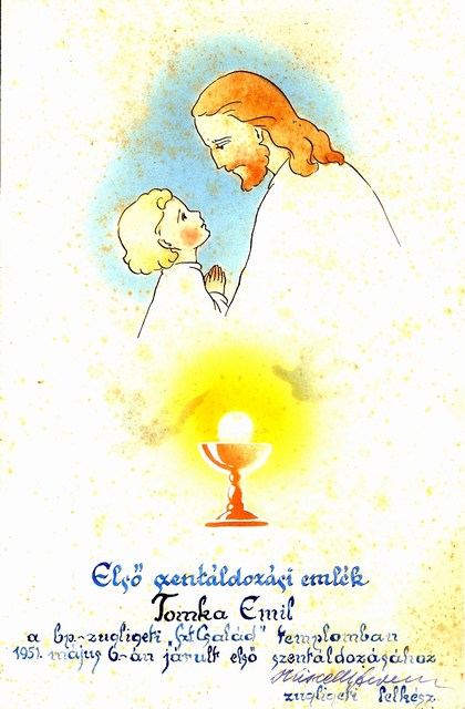 Első utunk ismét a Cordához vezetett. Ez idő tájt már nem lehetett első áldozási képeket kinyomtatni. Megbeszéltük tehát, hogy majd mi Erzsébettel nekilátunk ilyeneket rajzolni. Úgy belejöttünk a munkába, hogy naponta százával készítettük a véleményünk szerint szép első szt. áldozási képeket.”