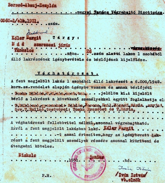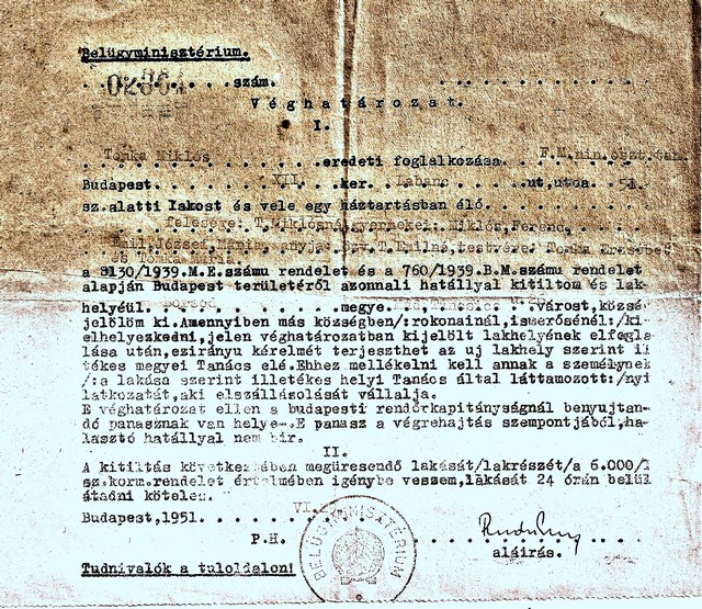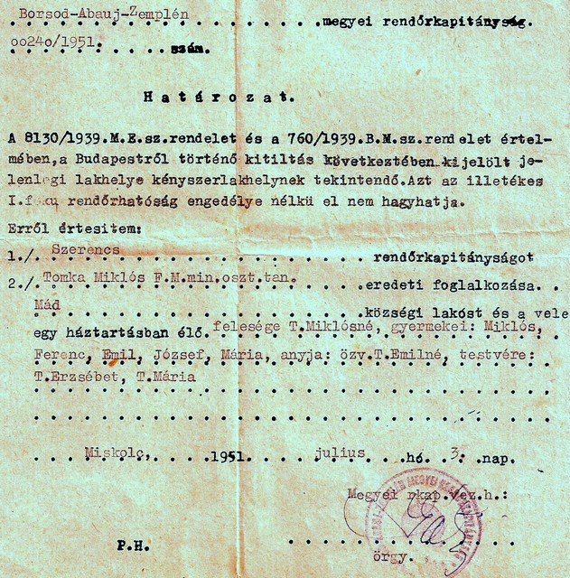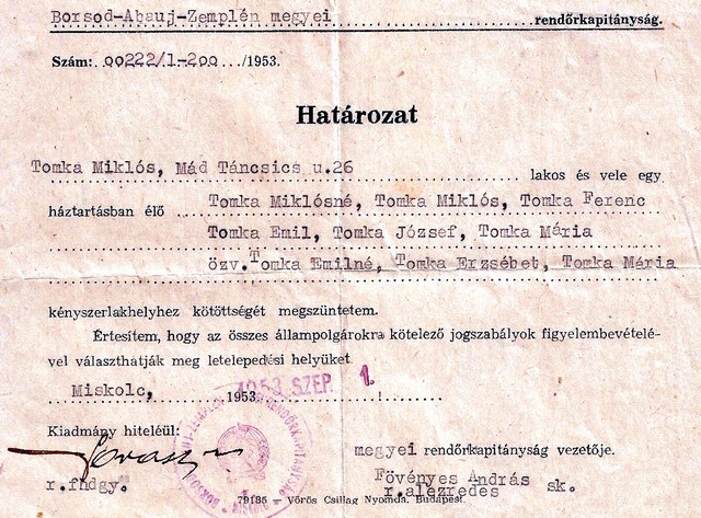Abban igaza volt, hogy – mint más kitelepítettek is – megérkezésünkkor mi egy írásos rendőrségi parancsot kaptunk, hogy a falut semmilyen körülmények között nem hagyhatjuk el. Nyilván az is megfordult a fejében, hogy, ha beutalná Miklóst a miskolci kórházba, azzal vádolhatnák, hogy egy osztályellenség elvette a helyet egy jó elvtárs gyereke elől…